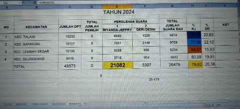 Data yang dihimpun media ini hingga pukul 17.45 WIB, Paslon Riyanda Jefri meraup sebanyak 21.083 suara, sedangkan paslon Deri Sesni hanya meraih suara sebanyak 5.397.