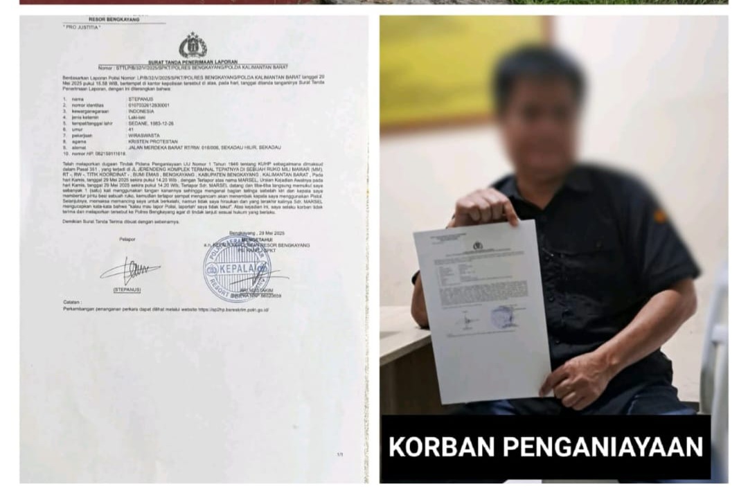 Berdasar kan laporan nomor: LP/B/32/2025/SPKT/POLRES BENGKAYANG POLDA KALBAR, tanggal 29 mei 2025 pukul 15:58 wib, sdra Stepanus telah melaporkan tindak penganiayaan UU no 1 tahun 1946 tentang KUHP sebagai di maksud dalam pasal 351 sesuai keterangan laporan juga bahwa korban di ancam mengunakan senpi, senjata api.