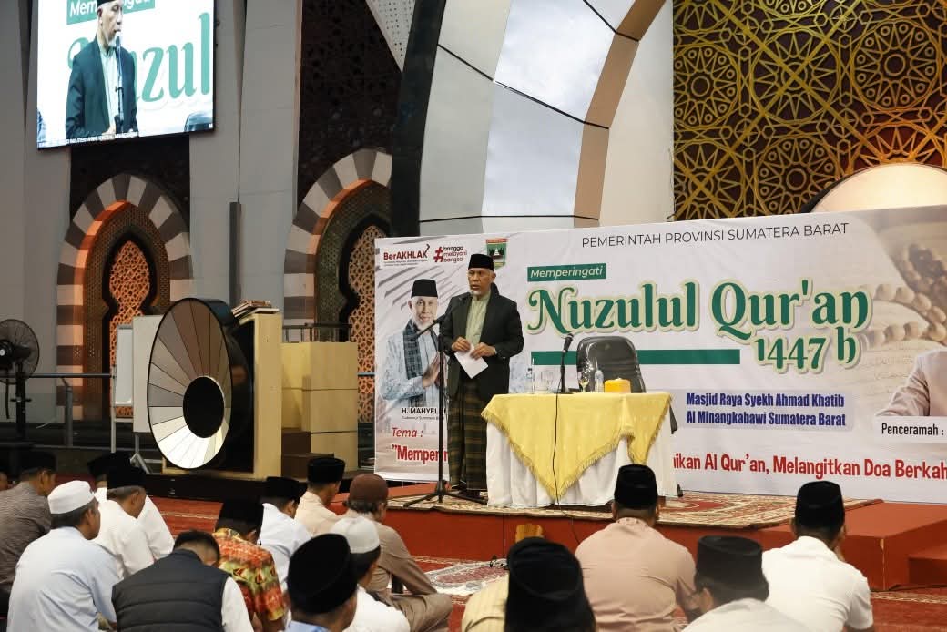 WARTA ANDALAS, PADANG – Gubernur Sumatera Barat (Sumbar), Mahyeldi Ansharullah, mengajak masyarakat untuk terus membumikan nilai-nilai Al-Qur’an dalam kehidupan sehari-hari. Ajakan tersebut disampaikannya dalam kegiatan peringatan Nuzulul Qur’an yang digelar Pemerintah Provinsi Sumbar di Masjid Raya Syekh Ahmad Khatib Al Minangkabawi, Kota Padang, Minggu (8/3/2026).